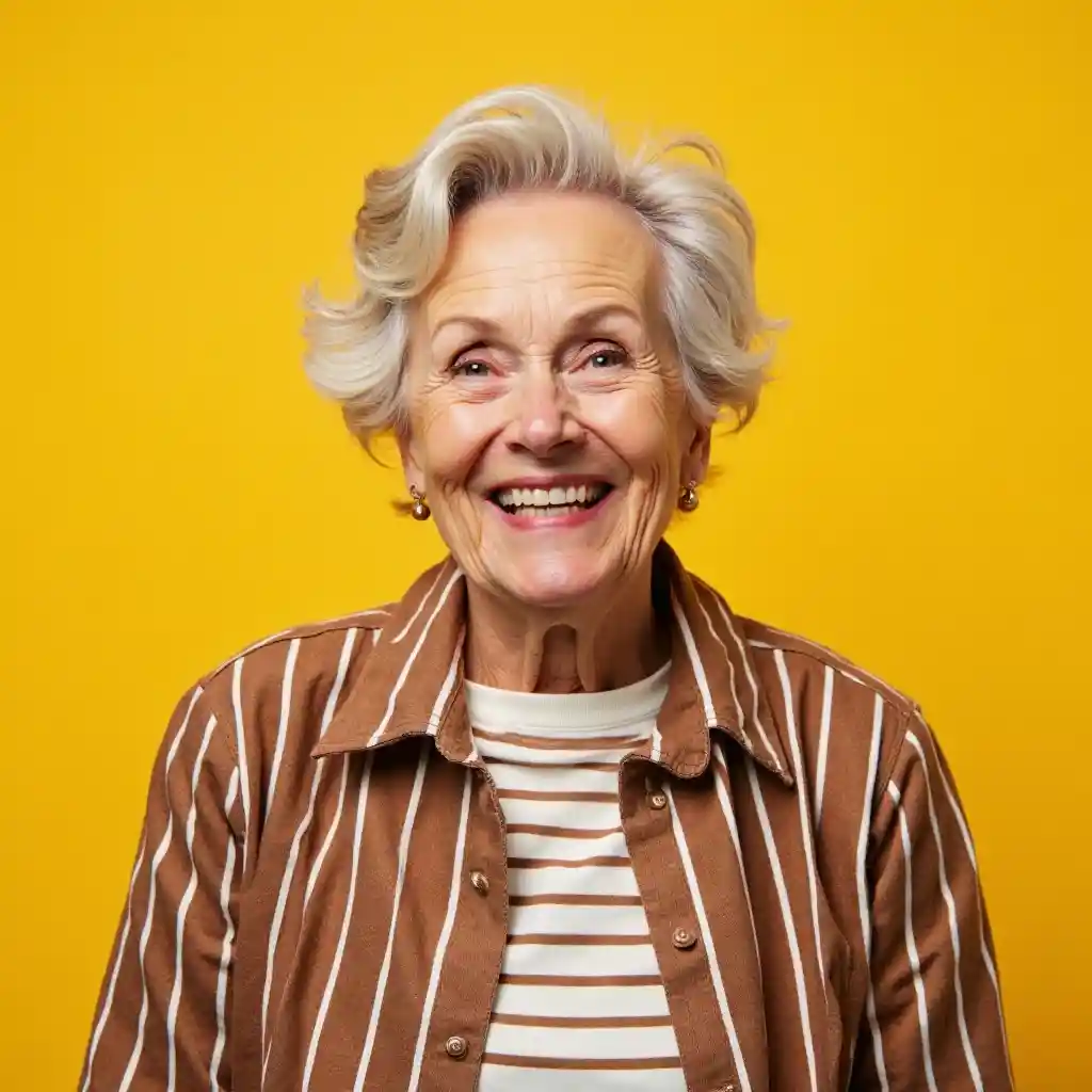 Mwanamke mzee mwenye furaha na anayecheka akiwa na koti lenye mistari kwenye eneo la kijani