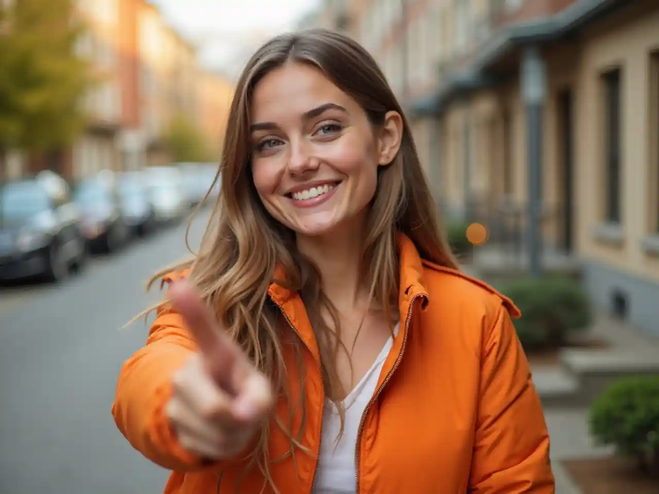 mwanamke, jaketi ya rangi ya machungwa, tabasamu, kidole, nje, vitongoji
