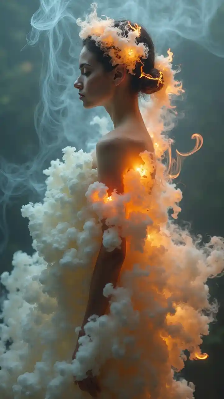 Mungu wa kike mwenye mwili wa nusu, aliye na sura ya upande, akiwa amevaa mavazi ya kuvutia ya rangi ya rangi ya juu. Moshi huo huchanua na kuharibika kila anapopumua, ukizunguka mwili wake kama dhoruba yenye harufu nzuri. Macho yake yanang'aa kama makaa