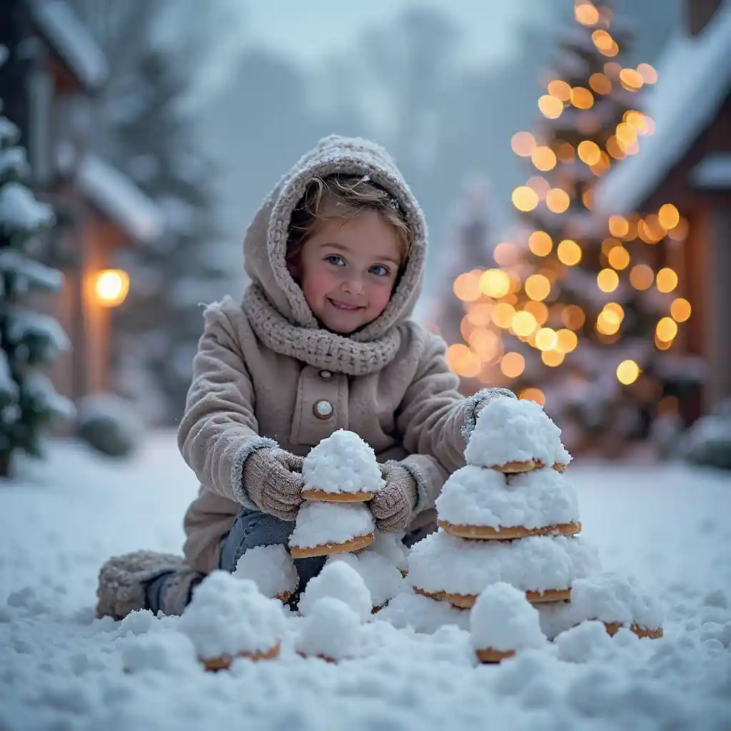 Msichana mweupe mwenye umri wa miaka 6 mwenye nywele za kijani anajenga ngome ya theluji katika kijiji cha theluji, akiwa amevaa kofia na mikono. Nuru zenye kung'aa na miti yenye baridi kali humweka katika mazingira yenye joto na furaha ya sherehe.
