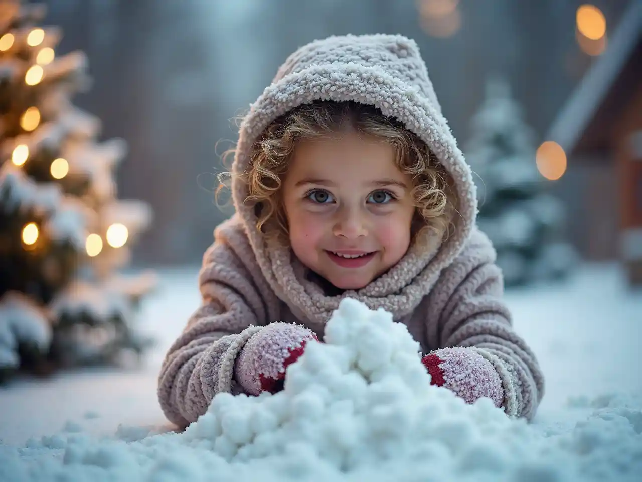 Msichana mweupe mwenye umri wa miaka 6 mwenye nywele za kijani anajenga ngome ya theluji katika kijiji cha theluji, akiwa amevaa kofia na mikono. Nuru zenye kung'aa na miti yenye baridi kali humweka katika mazingira yenye joto na furaha ya sherehe.