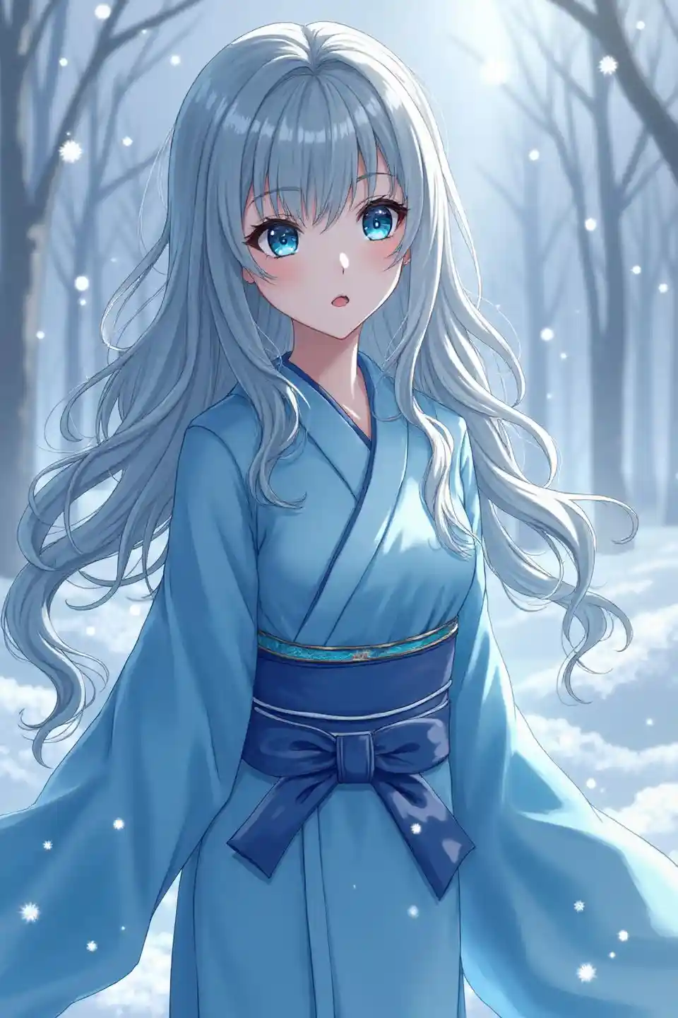FINNNIce Queen katika kimono, picha ya mwanamke theluji, Long kwamba Inaenea kwa Kiuno, Shining macho ya kina ya bluu, ajabu ndefu, mawimbi ya bluu, nywele anga