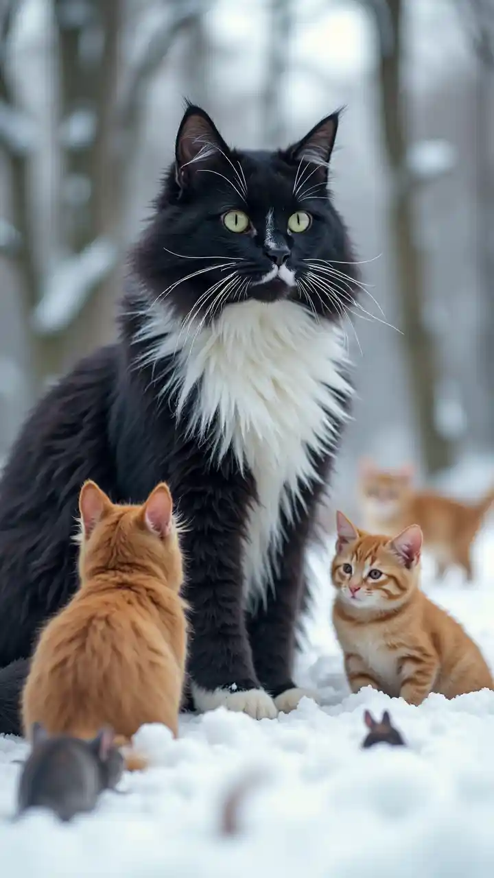 AubreyIceland nyeusi na nyeupe Maine coon paka katika mazingira ya theluji, na mbili nyekundu kawaida paka, na miti katika background, baadhi ya panya,