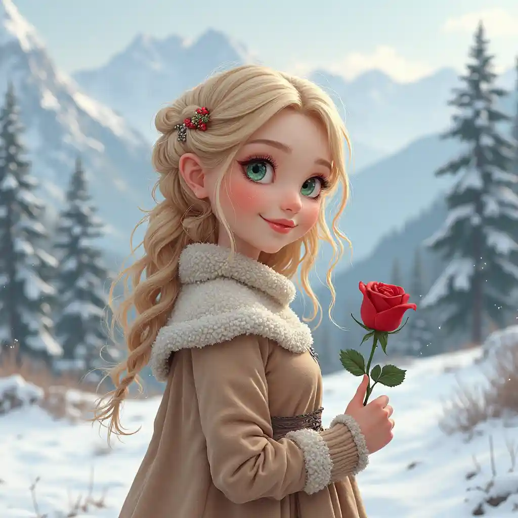 Mwanamke Anayecheka na Rose Katika Milima Yenye Theluji