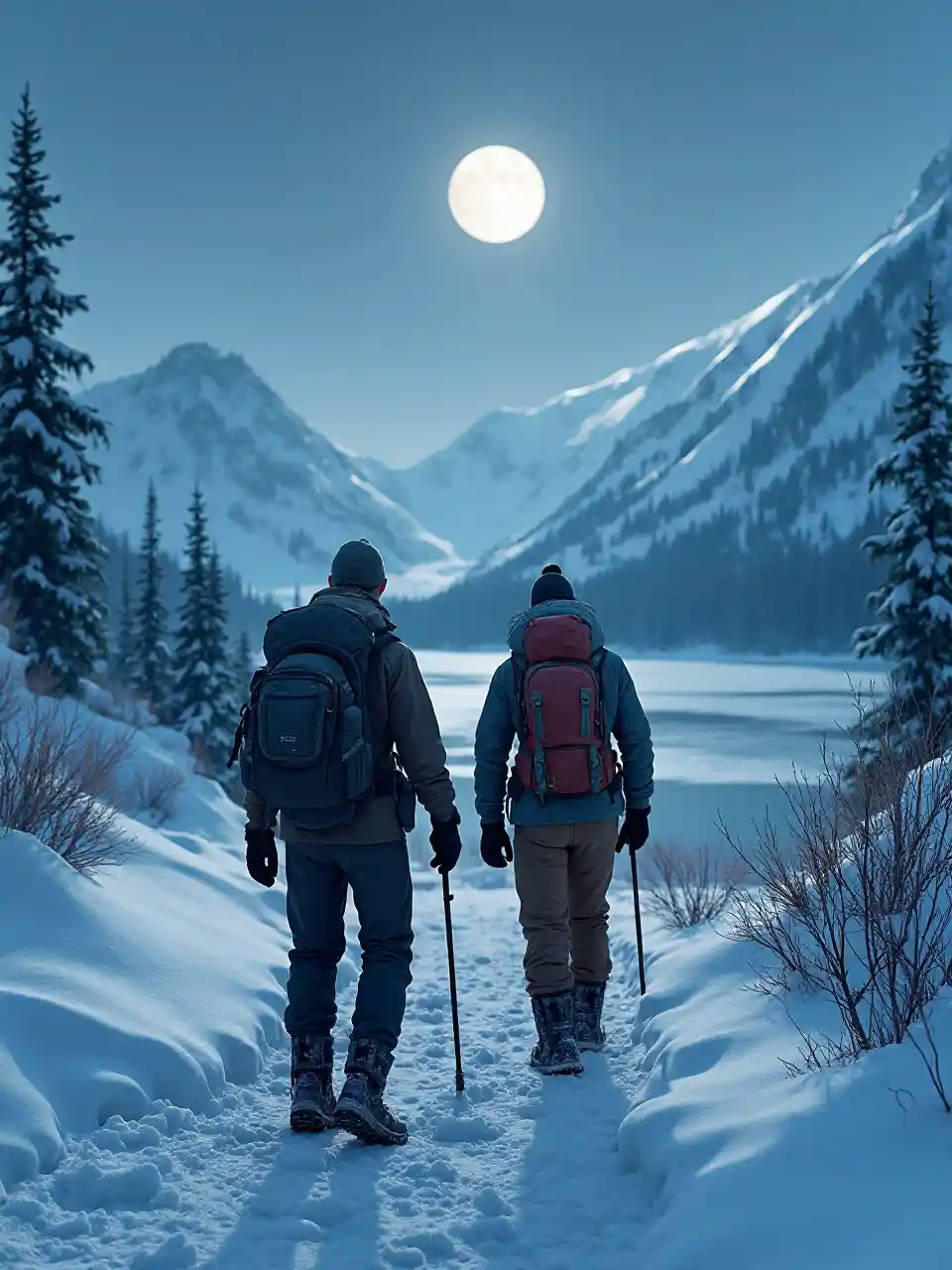 Wachunguzi wawili wenye nguvu wakitembea kwenye njia iliyofunikwa na theluji, milima iliyofunikwa na theluji nyuma, wakiwa wamevaa nguo nzito za majira ya baridi, viatu vizito, wakiwa na mifuko mikubwa, wakitembea kuelekea ziwa lenye baridi, usiku, mwezi kamili, picha halisi