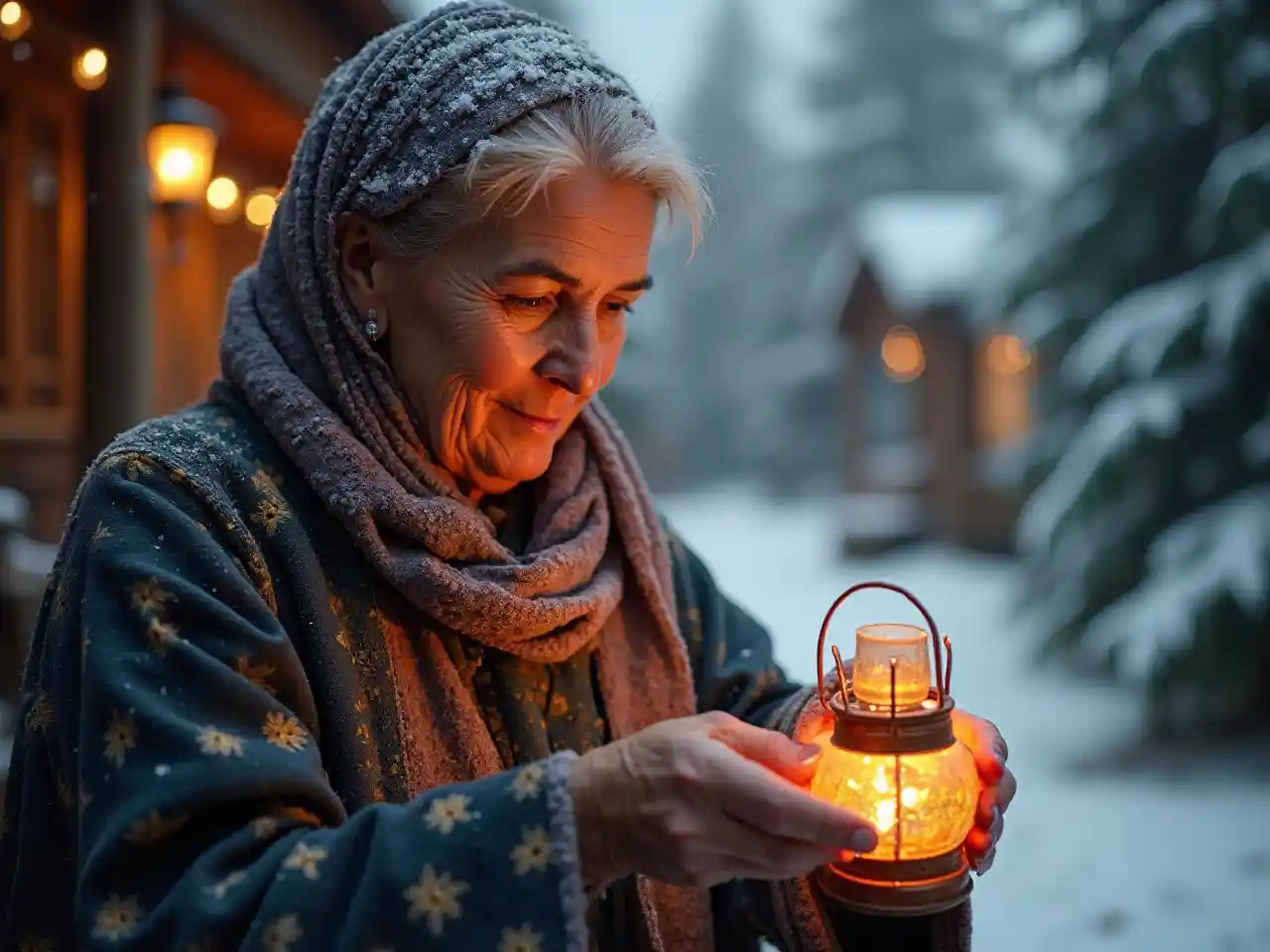 Mwanamke mmoja mwenye umri wa miaka 74 kutoka Mashariki ya Kati akiwa na shati, anafanya taa katika kijiji kilicho na theluji. Nuru zenye kung'aa na mialoni yenye baridi kali humweka katika mazingira yenye joto na yenye kupendeza. Mikono yake inaangaza kwa uangalifu.