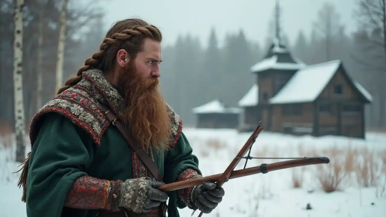 Askari-jeshi Mrusi wa enzi za kati katika taiga yenye theluji, ndevu za rangi ya kaskazini zenye viuno vidogo vya upande, nywele ndefu za rangi ya giza zilizofungwa katika viuno vire. Anavaa vazi la sufu la kijani-kibichi lenye madoadoa mekundu na silaha ya ngozi na chuma (kuyak). Ana upinde wa mbao wenye mifumo ya chuma, tayari kupiga risasi. Nyuma, kijiji chenye ngome ya mbao (kremlin) chenye miti ya birchi. Mtindo wa kweli, anga la kihistoria na baridi, miundo ya kina sana kwenye ndevu, mavazi ya vita, na theluji. Nuru yenye kuvutia, rangi baridi zenye rangi nyeupe, kijani, na kijivu".