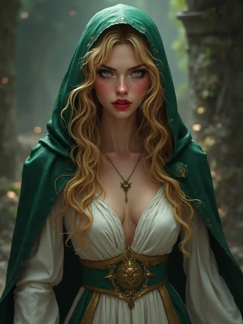 mchawi mwanamke, mashavu nyekundu, midomo nyekundu, blonde na nywele curly, macho ya bluu, kijani cap, mavazi meupe na maelezo ya dhahabu, hasira mood, medieval fantasy