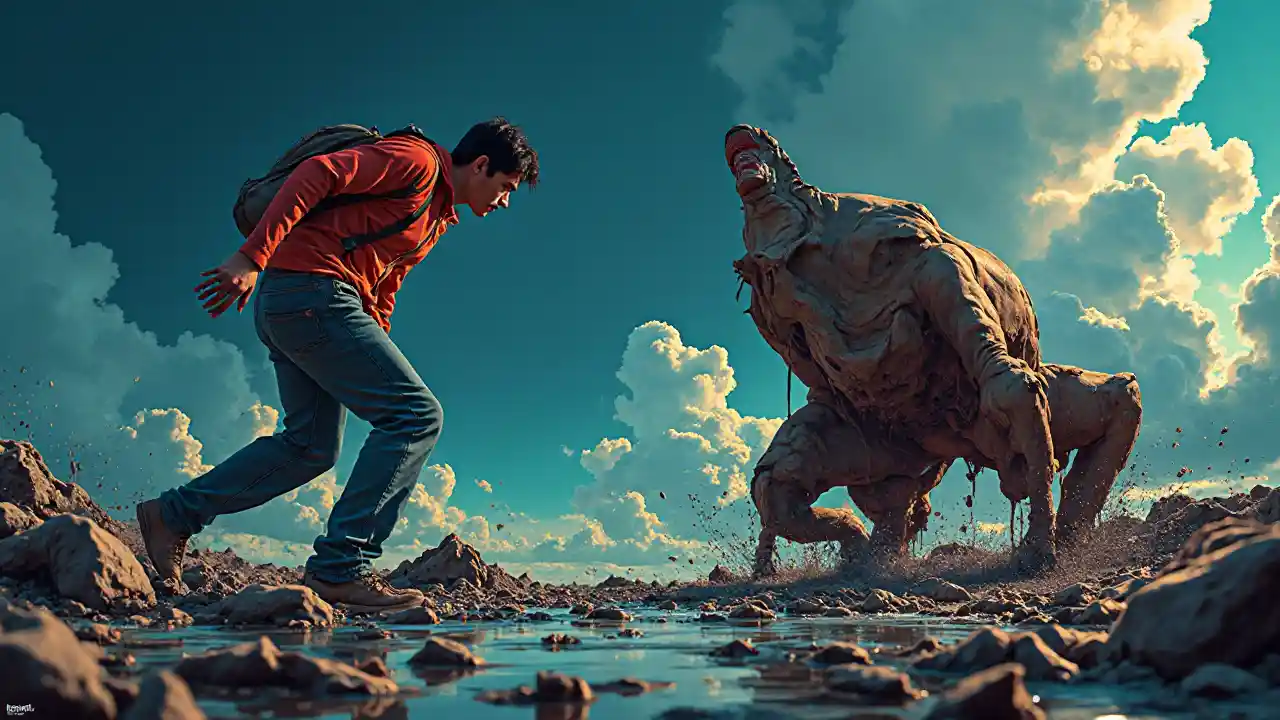 Picha ya nguvu, ya kusisimua ya mtu wa Asia ya Kusini, angalia viatu vya uharibifu. Picha ina bluu tajiri, kijivu, na nyekundu, kitabu cha kuchekesha/aesthetic ya posta, na miundo ya kweli, mionzi ya lensi, , ikiwasilisha ujumbe wa kuchekesha, lakini mbaya, juu ya kukabiliana na adui anayeonekana kuwa mdogo, lakini anaweza kuwa na shida.