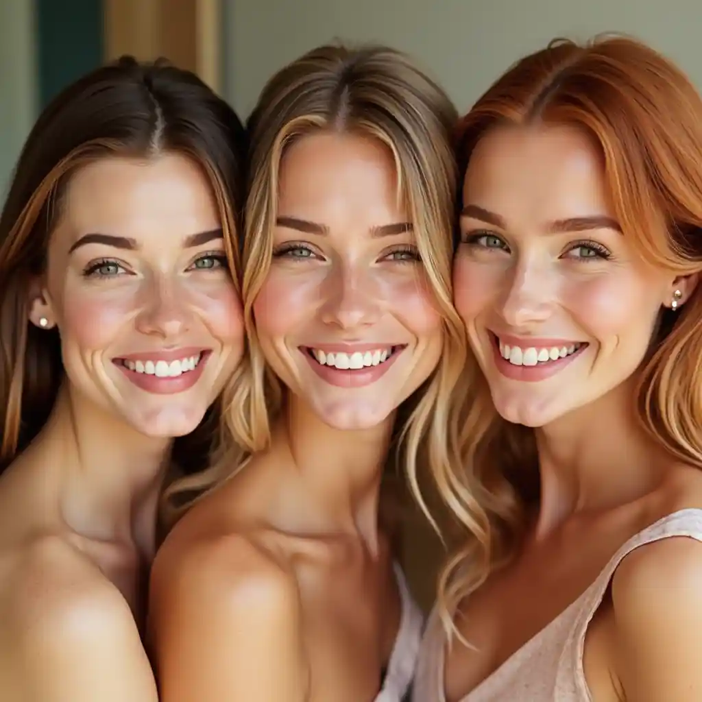 Lincolnwanawake watatu brunette, blonde, nyekundu, nyuso asili, na nyuso tilted kushoto, tabasamu nzuri, matibabu ya ngozi, spa