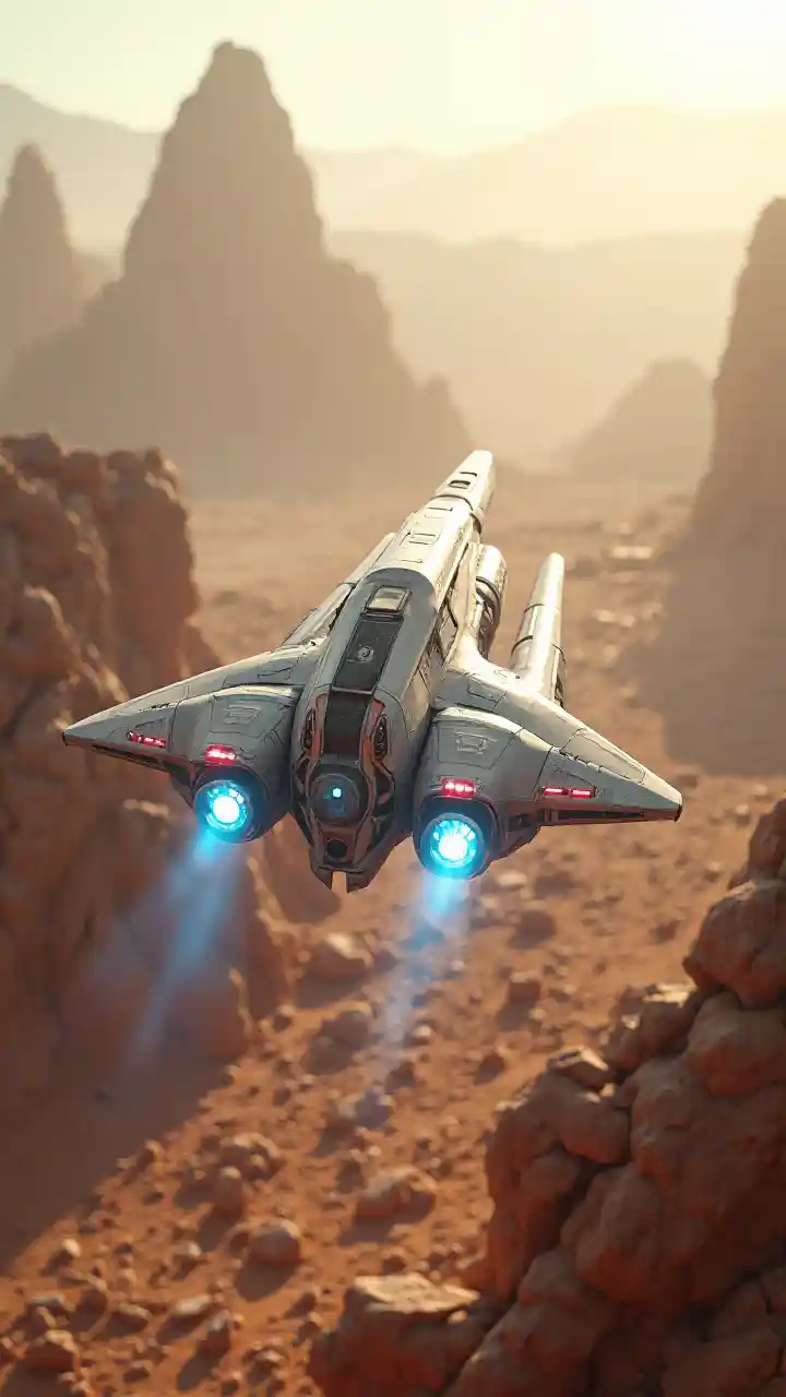 Katikati ya mandhari isiyo na rutuba iliyo na miamba mingi, meli ya anga yenye kuvutia na yenye kuonekana baadaye inazunguka kwa uzuri rangi nyororo za anga yenye vumbi, ikiangazwa na jua lisiloonekana. Uso wake wa chuma, unaokaziwa na taa nyekundu na nyeupe, unaonyesha ubuni wa hali ya juu, na nguvu zake. Nyuma ya meli hiyo kuna vifaa vinavyotoa miali ya bluu yenye kung'aa, na hivyo kutofautiana na sauti za udongo zinazoizunguka. Nyuma, umbo la milima ya mbali linaonekana, likidokeza eneo lisilo la kawaida ambalo huongeza hisia za kuchunguza na kutamani mambo mapya. Picha hiyo yenye kuvutia huonyesha hali ya kutatanisha na ubunifu, na kuwafanya watazamaji wafikirie matukio hayo.
