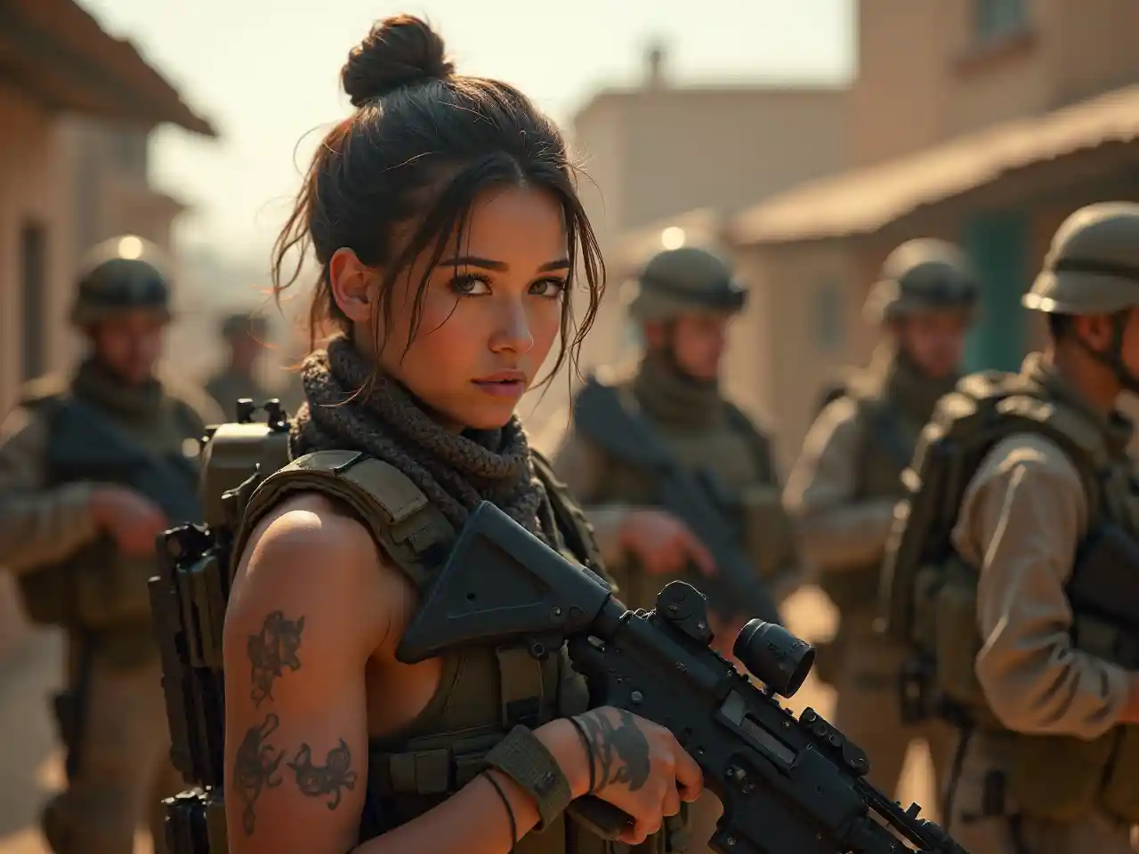 Digital dhana sanaa, picha ya kikundi ya wafanyakazi maalum, askari katika background, mbali sana, juu ya mwili risasi, moto nzuri ops msichana na tone mwili katika tank top, amevaa nzito safu ya kubeba mwili, shati shemagh shingo, bun brunette, kulenga bunduki, lengo kutoka bega, silaha lengo, silaha tayari, vita, doria ndani ya kijiji, kichwa akielekea njia nyingine, macho kuangalia kamera, tahadhari uso, nguvu, tofauti kivuli, taa ya jua, hi az, maelezo tata, uso wa kina, silaha ya kina, macho ya kina, UHD, 8K 85mm lenses, Sony A7R, bokeh