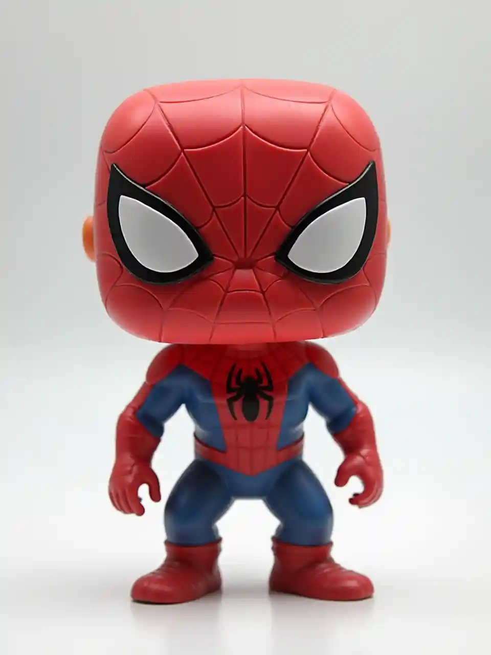 Funko pop Spiderman sanamu, kufanywa kwa plastiki, bidhaa studio risasi, juu ya background nyeupe, mwanga, katikati