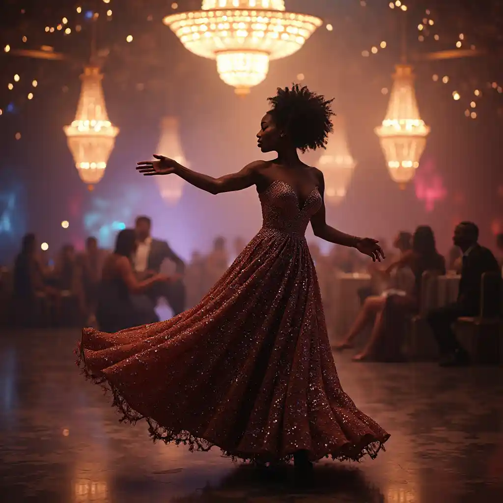 Akicheza dansi katika ukumbi wa dansi, mwanamke mweusi mwenye umri wa miaka 40 na kitu anavaa mavazi yenye nyota. Nuru na taa za taa zinazotembea humweka katika mazingira mazuri, na mwendo wake mzuri unatoa uzuri wa mbinguni.