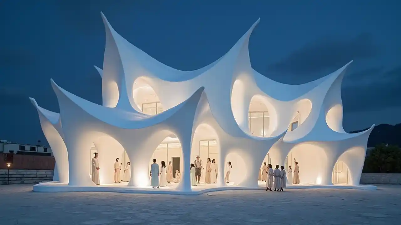 Sophiausiku, jengo nyeupe na maumbo curved mbele, katika mtindo wa nyota sanaa kundi (xing xing), wabunifu wanawake, eclectic mtindo, mavazi ya sanamu, ushawishi wa mijini, kitambaa