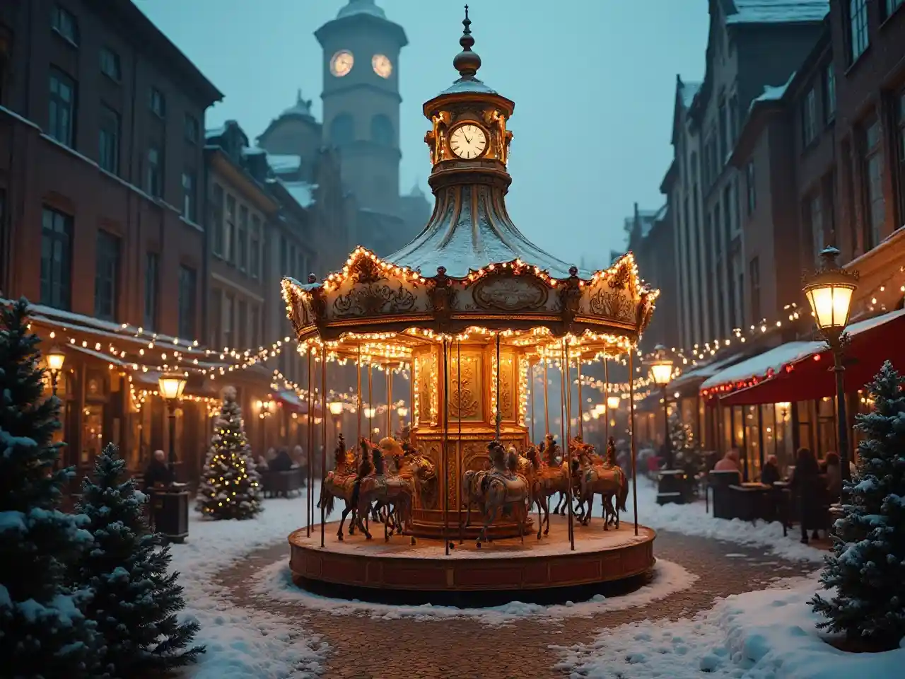 Complex, melancholic, nostalgic, steampunk-aliongoza, sherehe, furaha, hai, na Krismasi katika enzi ya Steampunk: sherehe mwanga mitaani, majengo ya juu, theluji katika mitaa na nyumba, katikati ya uwanja anasimama ajabu na kazi ya mitambo carousel, na taa, consoles ambayo viti hutegemea, saa katika towerset kuu: katika hofu ya sinema, articulated kupitia lensi neo-V, hawak na glide ya drone kamera, risasi na Emmanuel Lubezki, visualized in immersive 4K, kwenye jukwaa Vimeo ambapo taa ya sherehe ya kudumu twinkle juu ya mitaa nyembamba cobbled flanked na majengo makubwa ya viwanda.