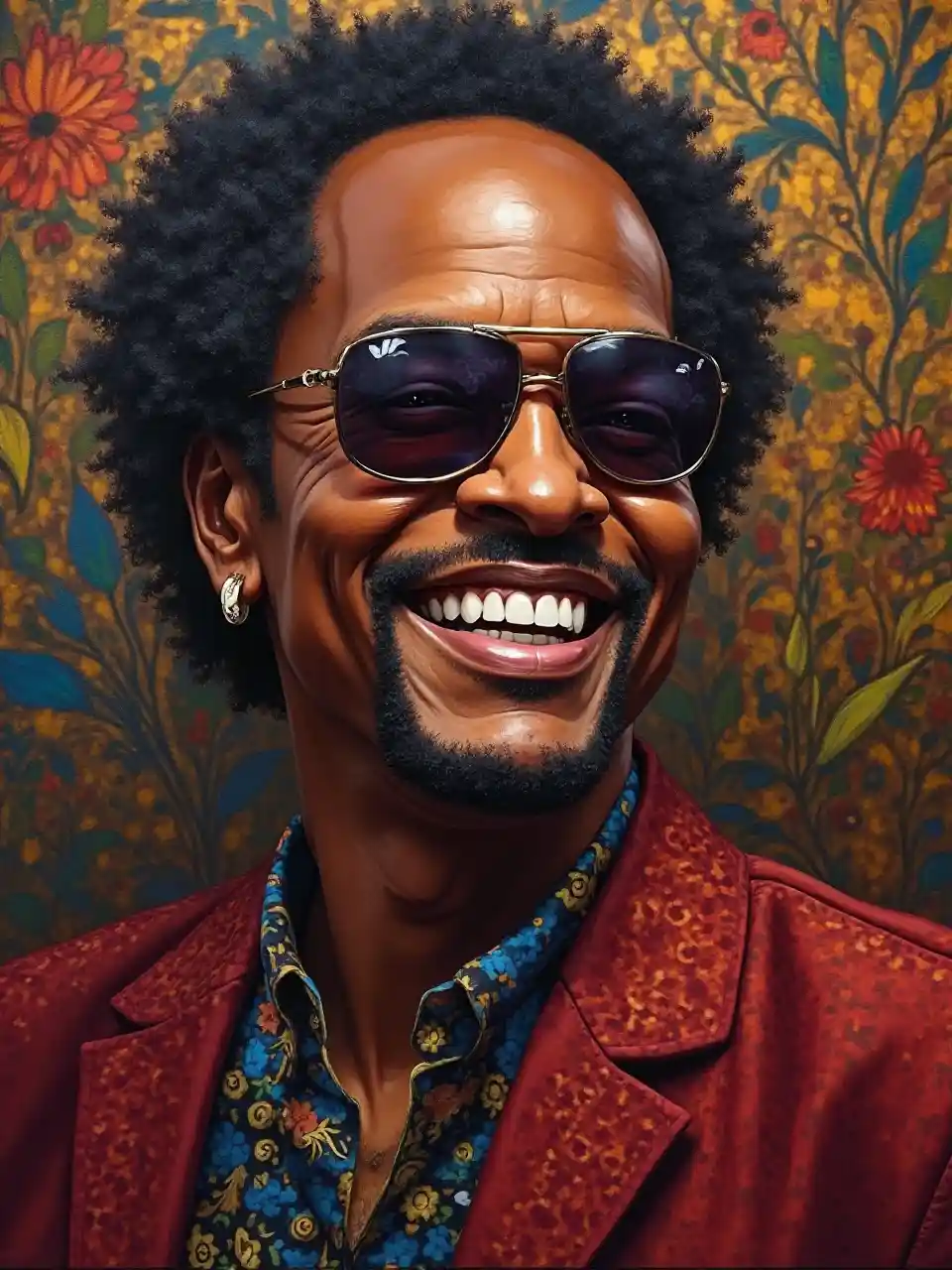 CalebPicha ya Stevie Wonder akitabasamu, picha ya mafuta, rangi zenye kuvutia, taa zenye kuvutia, mandhari ya Afrika