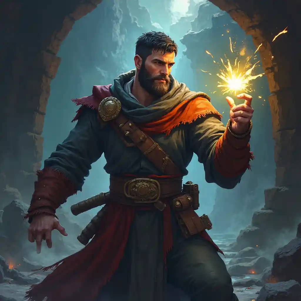 Kiume stocky kubwa vita-magi na nywele shortcut na ndevu, kushiriki katika mapigano casting uchawi mkali ndani ya dungeon, pathfinder, d & d mazingira, katika hali halisi high quality digital style, kuboreshwa kivuli quality, rangi