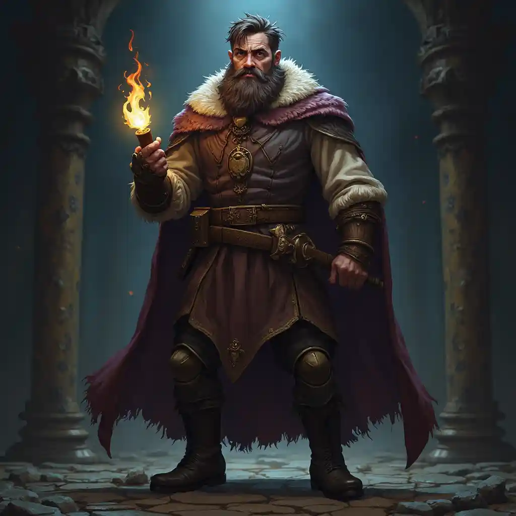 (Mwili kamili) kiume kichawi stinky kuhani na nywele fupi na ndevu, katika dungeon giza, njia, d & d mazingira, katika mtindo wa sanaa digital