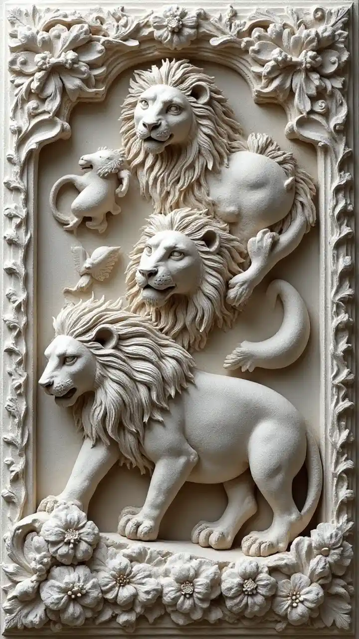 PenelopeMichoro ya ukuta yenye michoro ya mawe, inayoonyesha wanyama, simba, na mambo mengi ya kuchanganya, sanaa isiyo na maana, na mambo mengi ya kuchanganya