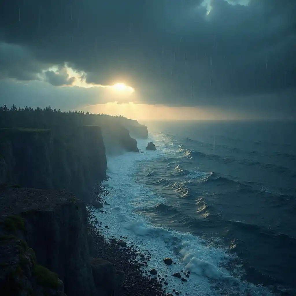 BenjaminDhoruba kali, mvua, pwani, Nordic, jua chini, dramatic, photo-kweli, Maelezo tata, taa ya sinema, karibu matone ya mvua, 8K, HDR, octane render