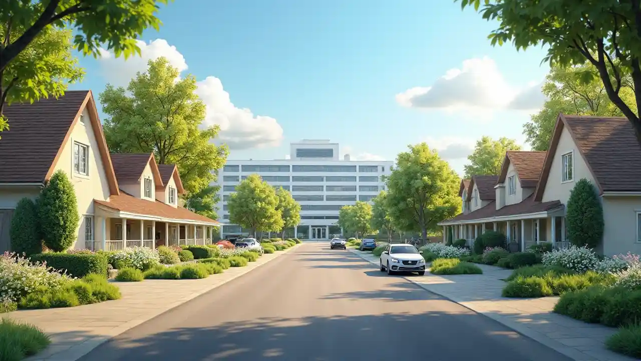 Picha halisi ya eneo la utulivu la vijijini, na barabara iliyohifadhiwa vizuri inayoongoza kwenye jengo kubwa la hospitali, limezungukwa na nyumba zenye kuvutia. Magari mbalimbali, kutia ndani magari na baiskeli, yanaonyeshwa yakienda barabarani. Mwangaza mkali wa asili huongeza mwangaza, na kuunda mazingira yenye joto na yenye kukaribisha, na mimea yenye kupendeza inayojipinda-pinda barabarani, na ubora wa HD kwa ajili ya athari halisi.