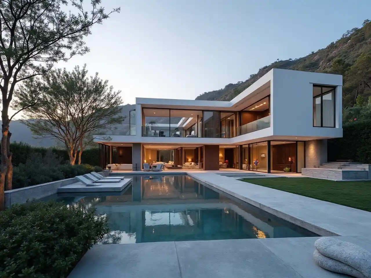 Nyumba ya kifahari ya kisasa, yenye mipaka safi na muundo wa kidogo-kidogo ambao hukazia uzuri wa mandhari inayoizunguka, na vitu vya starehe ambavyo huleta maisha ya anasa na ubunifu. Wasanii: Dario D'Ambrosio, Patricia Urquiola, Ole Scheeren, Mwanga wa Sinema