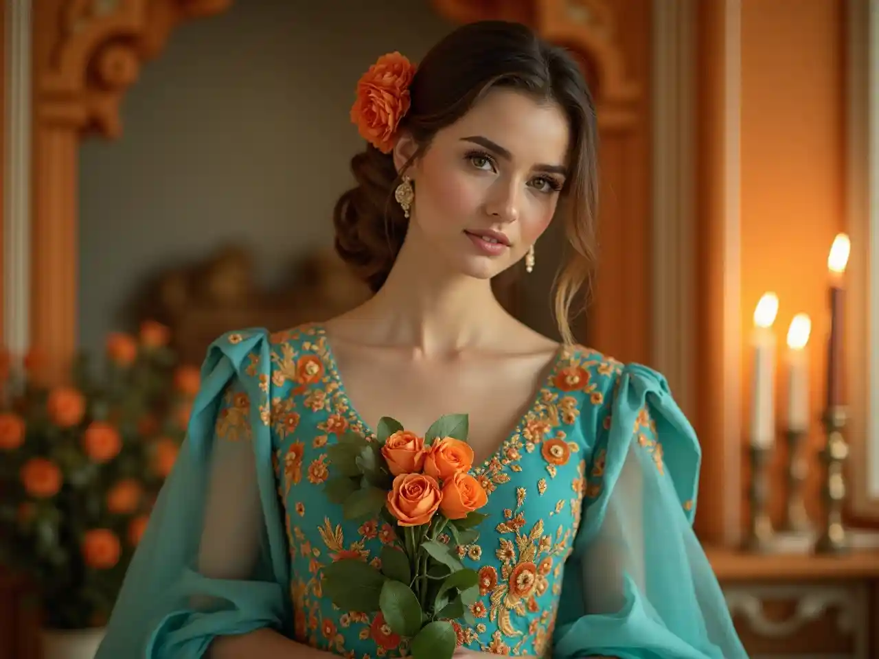 Akiwa amefunikwa na nuru laini, mwanamke kijana mwenye kuvutia anasimama, akiwa amevaa mavazi ya rangi ya turquoise yenye kupendeza na rangi ya machungwa. Nywele zake zenye kuvutia, zenye rangi ya machungwa, na vipuli vyake vinafanana na mavazi yake. Mkononi mwake, ana shada la waridi wenye rutu nyingi za rangi ya turquoise na ya rangi ya machungwa, ambazo zinalingana na vazi lake. Mahali hapo pana mambo ya kihistoria yenye kupendeza, na taa za mishumaa zinang'aa karibu na mahali pa kupangia na rangi ya machungwa, na hivyo kuunda mazingira ya sherehe yenye kupendeza. Muundo huo wote unavutia na ni wenye kuvutia sana.