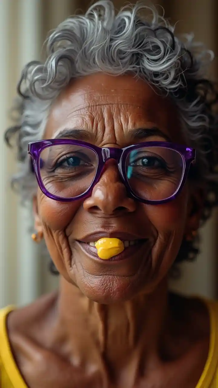 Mwanamke Mweusi Mzee Mwenye Miwani ya Zambarau na Kioo cha Midomo ya Njano