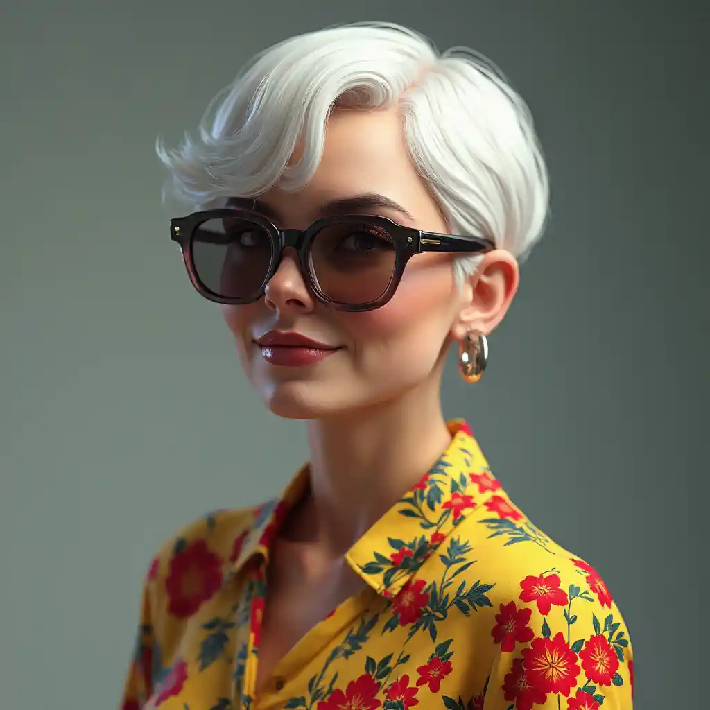 Picha ya mwanamke mzuri mtindo mzee na nyeupe platinum nywele fupi na miwani kubwa, glamorous Hollywood picha, kweli sana, daz3d, wanawake wabunifu, azimio la juu, sana mtindo, mavazi kama mwanamke kijana