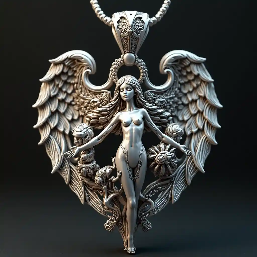 3D rendering tata kina ya sana stylized, fedha safi, pendant na mfano wa malaika watatu katika kubuni. sanaa, art deco, exquisitely nzuri, kichawi, kichawi