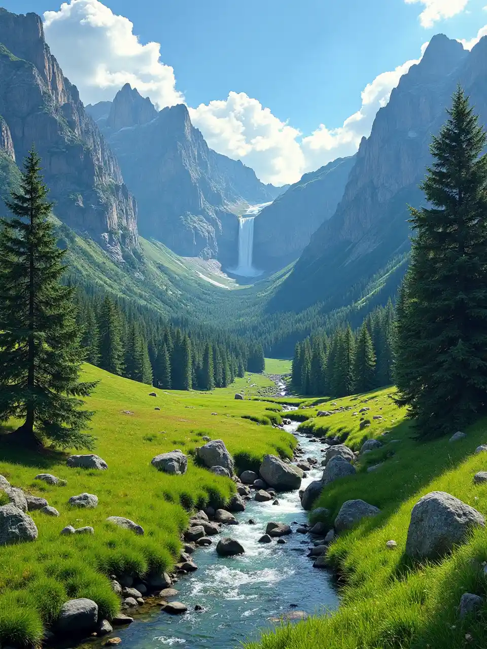 Mazingira haya yenye kupendeza ya kiangazi yanaonyesha bonde lenye amani lenye milima, lenye mwangaza wa jua, na bonde lote, kutia na vilele vyake, na sehemu zake, hazina theluji. Maporomoko makubwa ya maji huteleza kwenye miamba migumu, na kutokeza mto safi ambao hupita kwa upole kwenye nyasi zenye rutu. Shamba hilo lina majani mengi, na lina miti mirefu ya mialoni inayotikisika kwa upole na upepo wa majira ya joto. Vilele vyenye kuinuka vya miamba iliyo wazi na miteremko ya kijani-kibichi huonyesha mandhari hiyo, ikitofautiana sana na anga la bluu lenye mawingu meu. Majani yenye kupendeza na maji yanayotiririka yanaonyesha hali ya kiangazi katika paradiso ya asili.