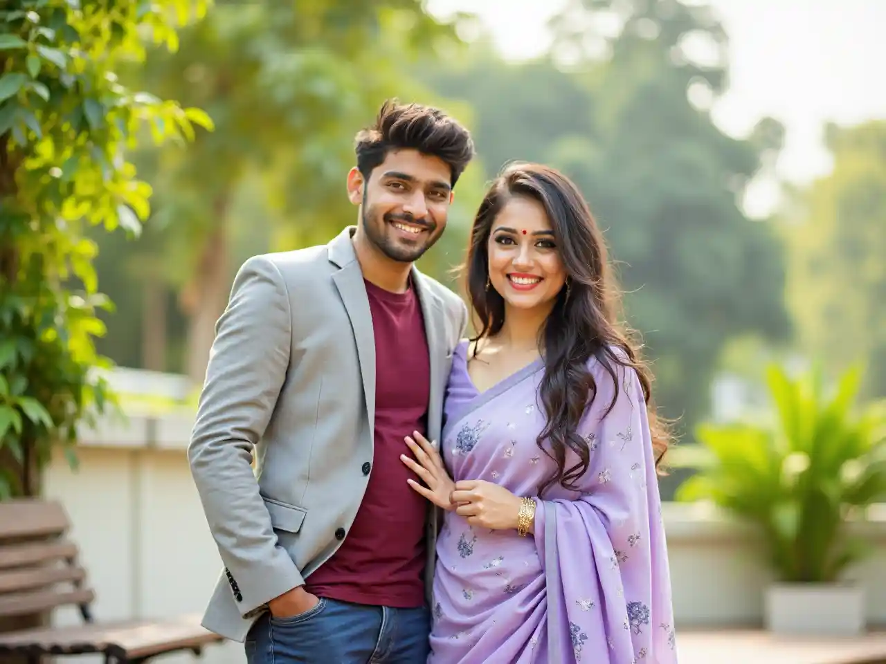 Kijana na mwanamke wakiwa wamefunikwa na jua, wanajionyesha wakiwa nje, wakionyesha wakati wa sherehe. Mwanamume huyo, akiwa amevaa blazer ya kijivu juu ya shati la rangi ya burgundy, anasimama kwa uhakika na tabasamu nyepesi, huku mwanamke aliye karibu naye akiwa amevaa sare ya rangi ya zambarau iliyo na michoro ya maua, nywele zake zikipiga mawimbi. Nyuma yao, kuna mimea mingi, na ukuta mweupe na benchi zinaonyesha mahali pa umma. Hali ya hewa yenye furaha huimarishwa na anga safi na mwangaza wa mchana, na hilo linaonyesha kwamba kuna pindi ya sherehe ambapo watu wawili wanaonekana kuwa na furaha na urafiki.