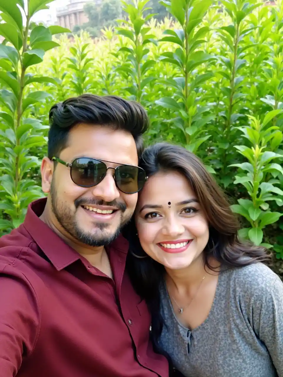 Watu wawili wanajipiga picha wakiwa na furaha, nyuso zao zikiwa zimeangazwa na jua. Mwanamume huyo, akiwa amevaa miwani maridadi na shati jekundu, anaonyesha tabasamu ya uchangamfu, huku mwanamke huyo, akiwa amevaa bindi ya kitamaduni na mavazi ya kiji, akiwa karibu naye. Majani yenye kupendeza yanayozunguka yanaonyesha mahali penye utulivu, labda bustani au bustani, na kuna ishara za ujenzi. Picha hiyo inaonyesha wakati wa shangwe, na kuonyesha hali ya utulivu na ushirika, huku ukitazama uzuri wa asili.