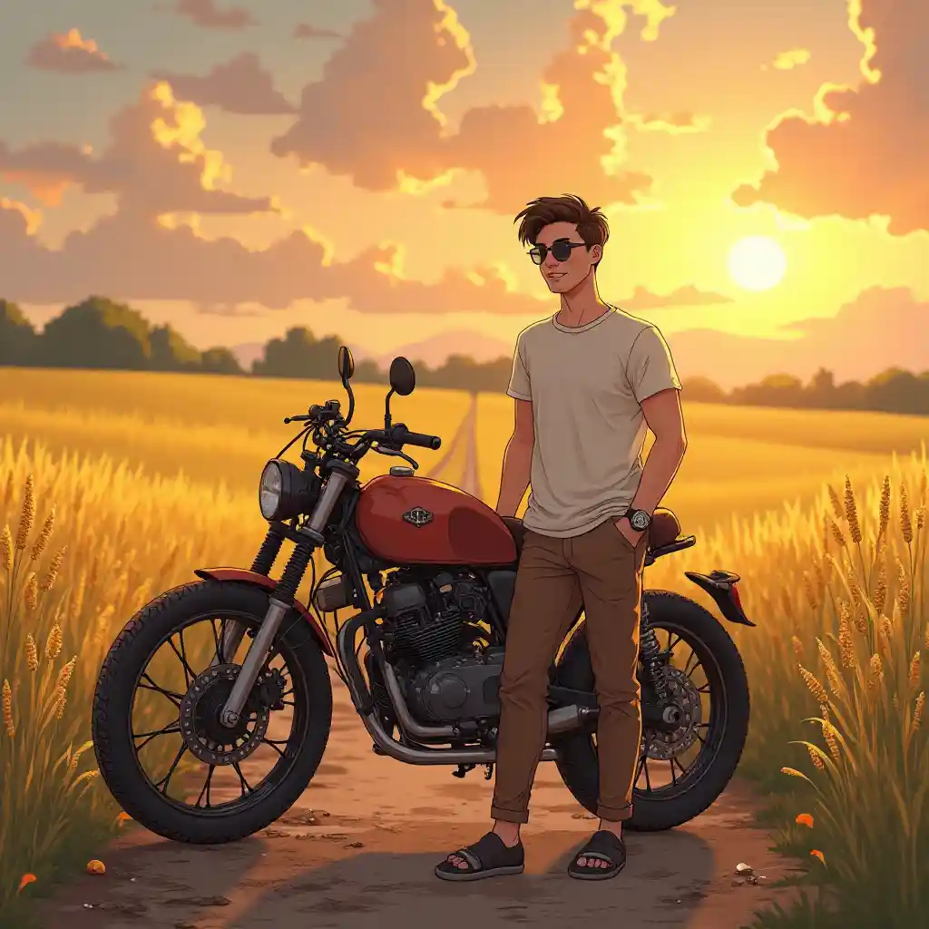 Kijana mmoja akiwa amefunikwa na jua lenye joto, anasimama kwa uhakika kando ya pikipiki yake, ambayo inatua kwenye barabara ya mchanga iliyo na mashamba ya ngano. Akiwa amevaa shati nyeupe na suruali za rangi ya kahawia, yeye huvaa miwani na saa, akionyesha tabia ya utulivu na yenye mitindo. Msimamo wake - akiegemea baiskeli na mguu mmoja ukikaribia ule mwingine - unaonyesha kwamba amepumzika na kuwa na mawazo mazuri. background ya machweo enhances eneo, akitoa mwanga juu ya mazingira na kuonyesha utulivu wa mazingira haya ya vijijini, evoking hisia ya adventure na uhuru. kubadilisha picha hii kwa studio Ghibli style