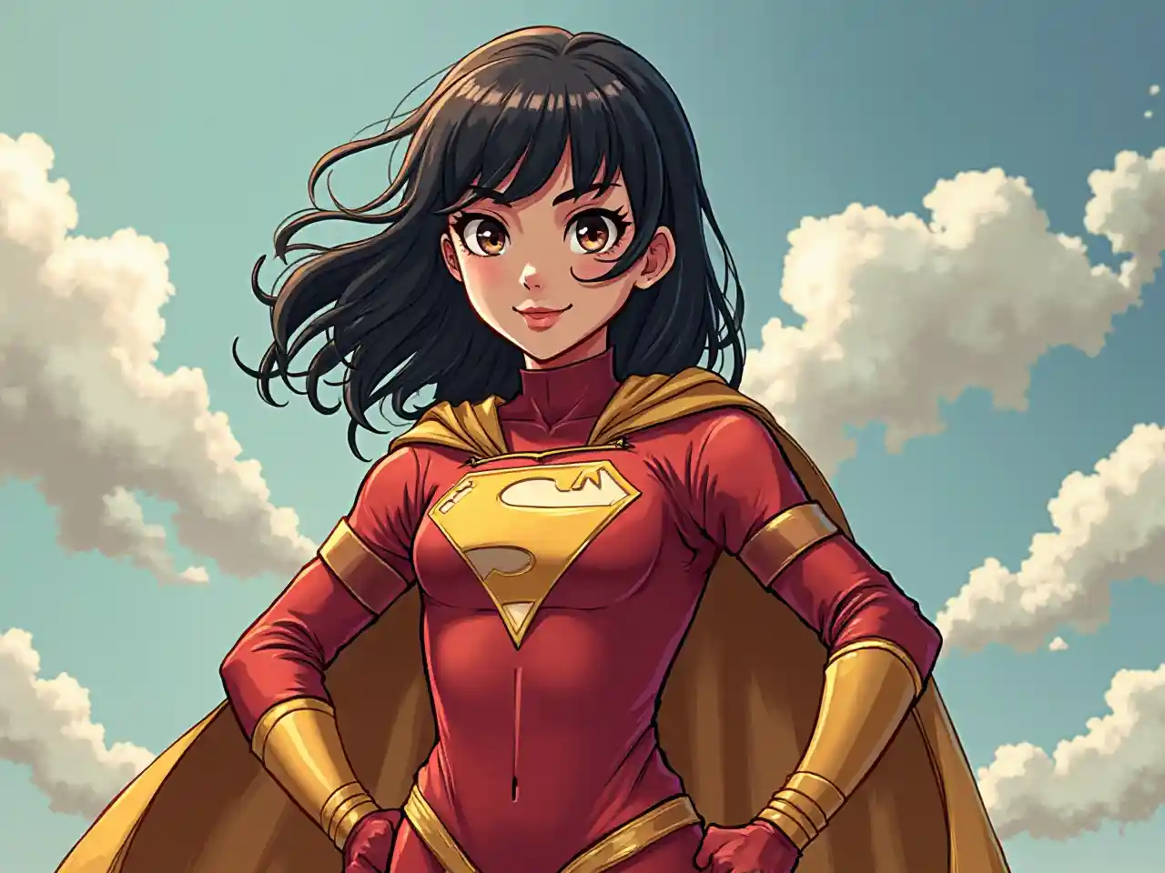 Brooklynteenage msichana superhero na pose nguvu na cute uso, Kichina macho, haja ya mbele nywele bang katika suti yake super msichana