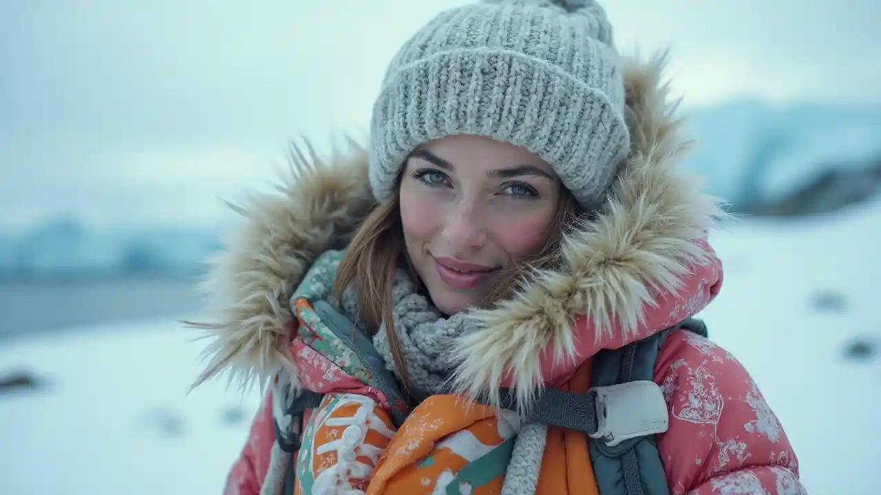 Skylarwazi picha-mwaandishi wa habari risasi] [French supermodel, stunning Arctic outfit, Antarctica] [bustani rangi, tamasha asili] [bluecore, snowcore] [risasi juu ya format kati sinema], sinema, 8k, masterpiece