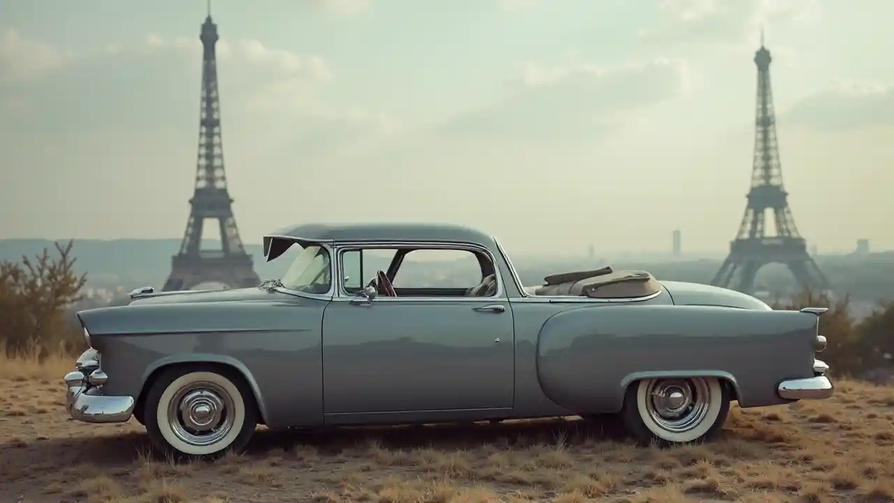 1952 Chevrolet kijivu, na Mnara wa Eiffel nyuma, surreal, mandhari, sauti