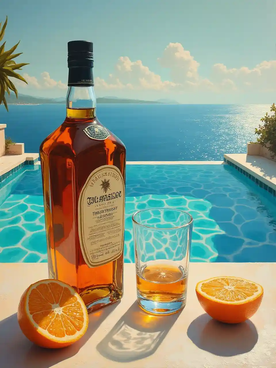Unda uchoraji wa mafuta katika mtindo wa surrealist uliopuliziwa na Michael Parkes, na glasi ya whiskey na chupa ya whiskey ikisimama kando yake, pamoja na mandarin iliyokatwa, iking'ania kwenye jua. Mahali pa tukio ni bwawa kubwa la kuogelea lenye maji ya chumvi, lililoko kando ya bahari kwenye dari ya nyumba ya kifahari huko Monaco. Ni lazima tuzingatie chupa, glasi, na mandari, na mandhari ya rangi ya bluu na dhahabu, na mapambo ya Salvador Dali na Gustav Klimt. Rangi inapaswa kuwa na azimio kubwa na ya kweli