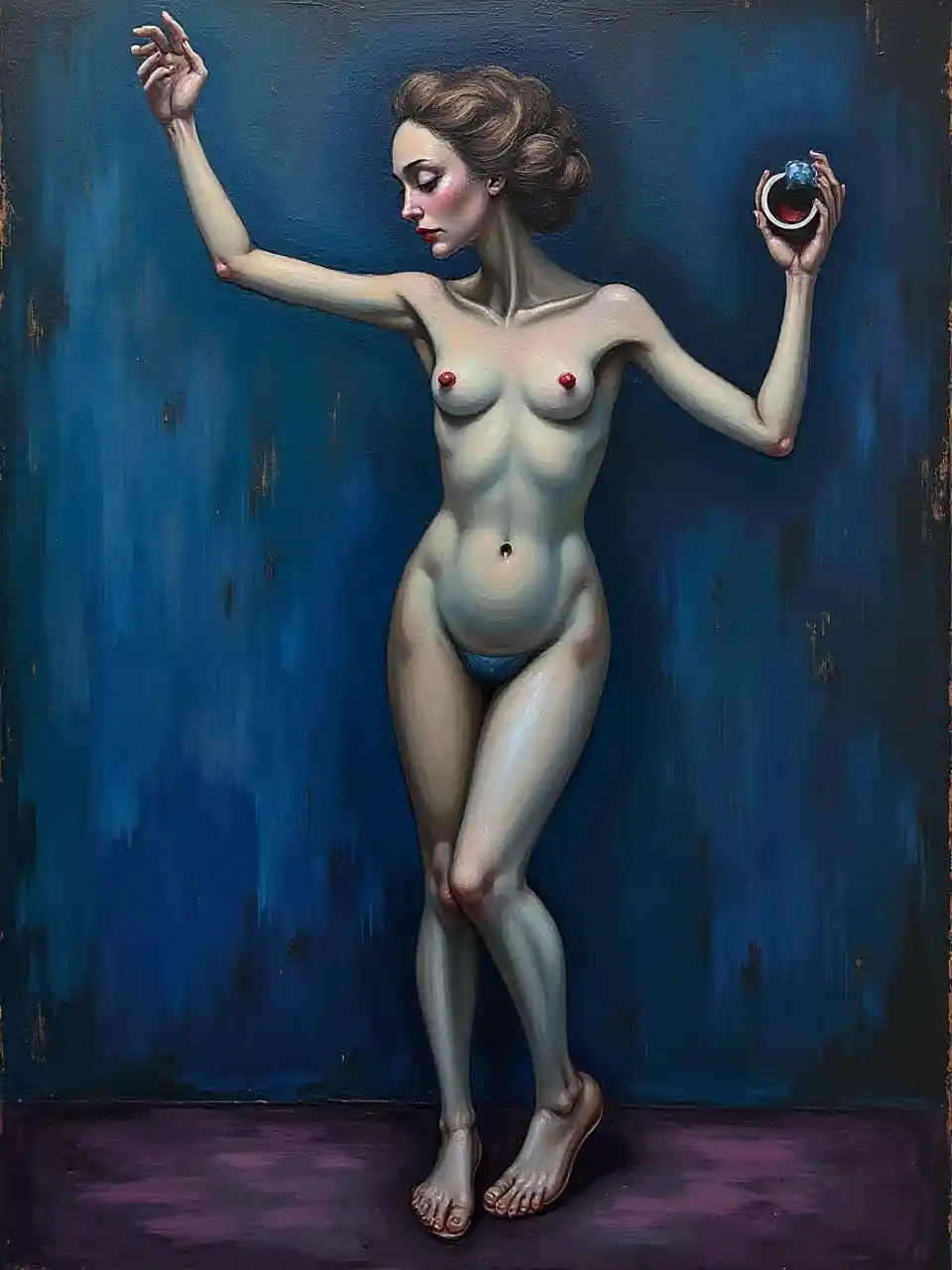surrealist acrylic uchoraji mafuta, mtu kucheza, mwili mzima ikiwa ni pamoja na kichwa na miguu, sanaa nje, sanaa ya awali, rangi ya giza, bluu, rangi ya rangi ya rangi ya 1930s,