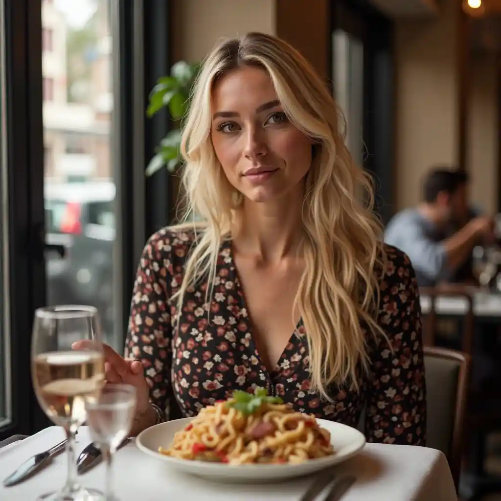 EllaSwedish blonde mwanamke inapaswa nywele ndefu , macho kahawia kula chakula cha mchana katika mgao wa juu katika Amsterdam