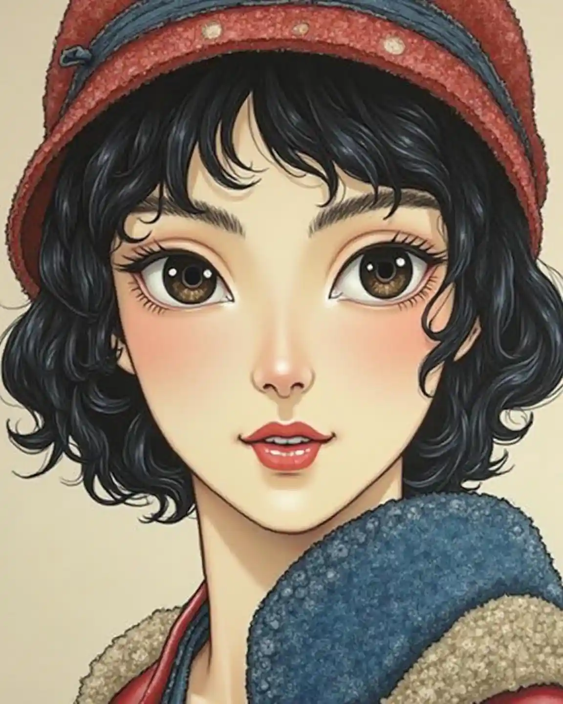 NoahWoman in Cloche、object、modern girl from the Taisho era、dark eyes、Wavy black hair、glossy lips、modern girl from the Taisho era風な髪型。realistic、Draw with oil pastels