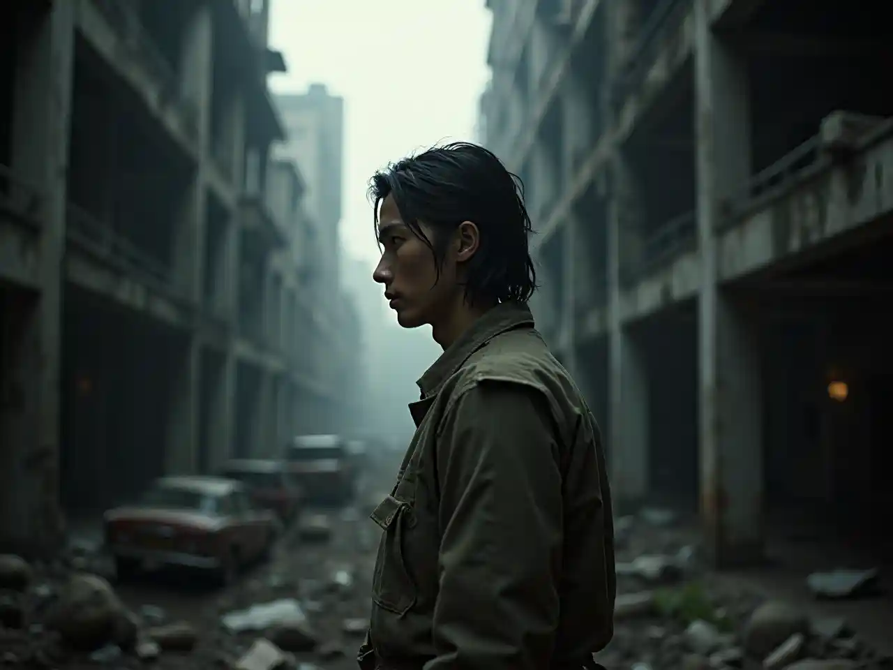 Picha RAW, 8k UHD, DSLR, mwanga laini, ubora wa juu, filamu ndogo, Takeshi Kaneshiro, mtazamo wa upande, Leica 85mm, Kodak Portra 800, athari ya chiaroscuro, f1.4 aperture, magofu apocalyptic, sherehe, stoic, sinema 4k, picha ya kina ilipokelewa kwenye Kodak, bokeh tajiri, ikikumbusha HBO ya Mwisho wetu, sanaa ya 4k, mazingira ya sinema.