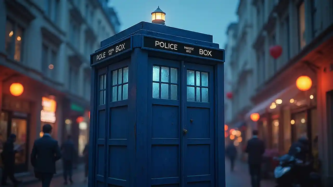 British polisi sanduku, aliongoza na TARDIS, mtindo wa zamani, nje bluu, mwanga mwanga juu, kuzungukwa na bustani mji, baridi taa jioni, anga hai, background kina na mambo ya mijini, aesthetic ya ajabu, hisia ya nostalgia, maelezo ya juu, azimio la 4K, ubora wa sinema.