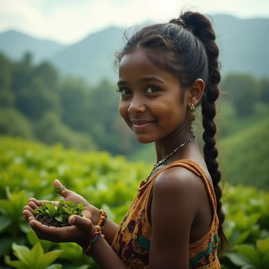 Picha ya kijana, giza na msichana mzuri mkulima chai kutoka kusini mwa India katika d Hindi Dramatic taa, kina cha shamba, mlima chai katika background incredibly high detailed, holding fresh tender tea leaves in hand