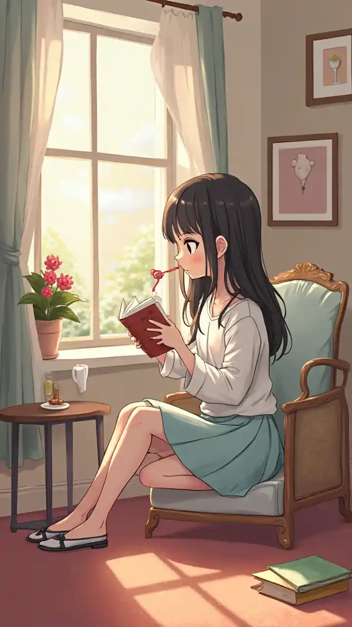 Mwangmfano wa msichana ameketi katika chumba chake na kunywa chai na kusoma kitabu