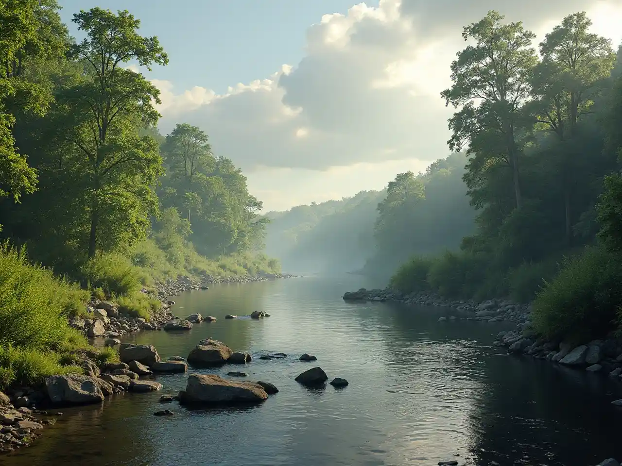 Mto Teays asubuhi ya kiangazi katika umri wa mwisho wa Messinia miaka milioni sita iliyopita, Amerika Kaskazini ya kale