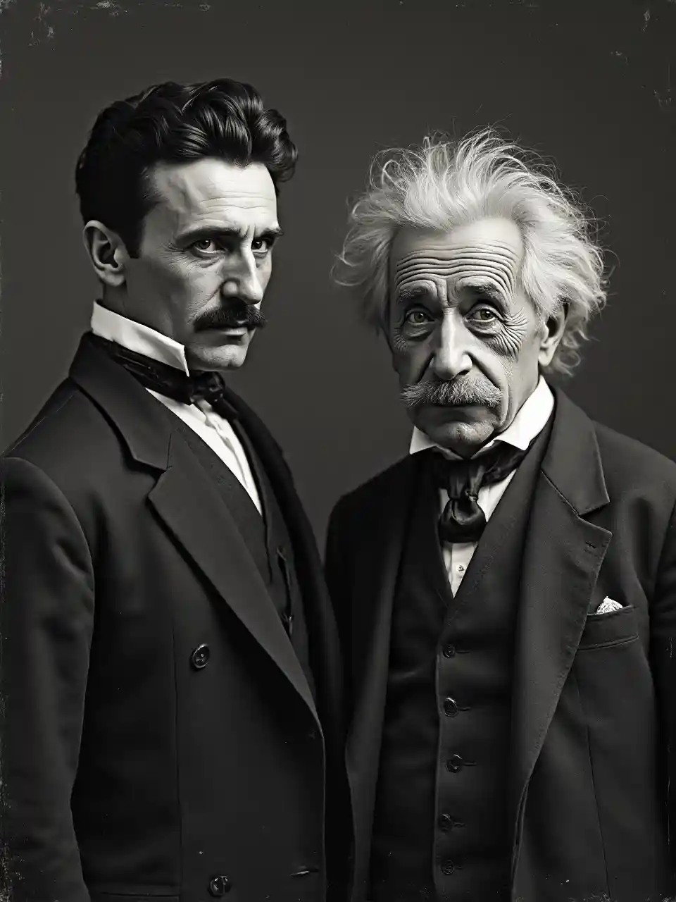 LaylaPicha ya Nikola Tesla na Albert Einstein wakitazama kamera
