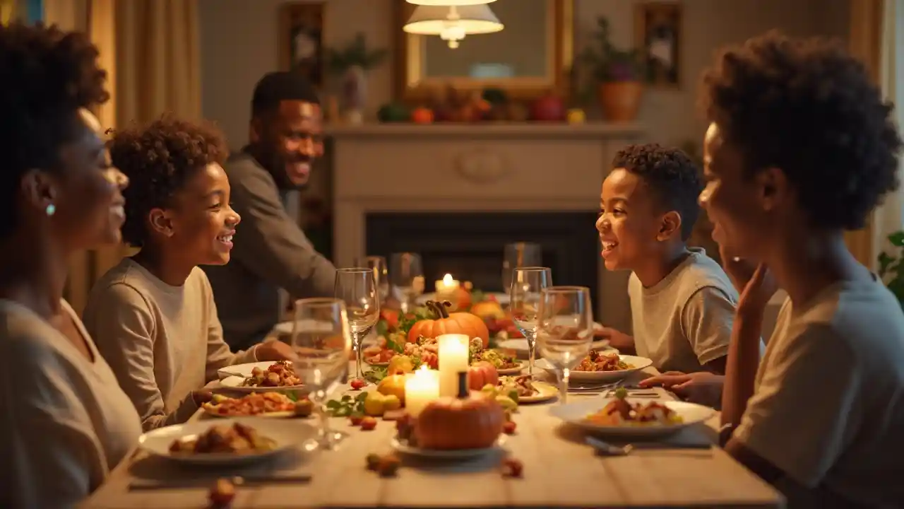 Familia nzuri ya AI nyeusi ikikaa kwenye meza ya chakula cha jioni na kusherehekea Siku ya Shukrani