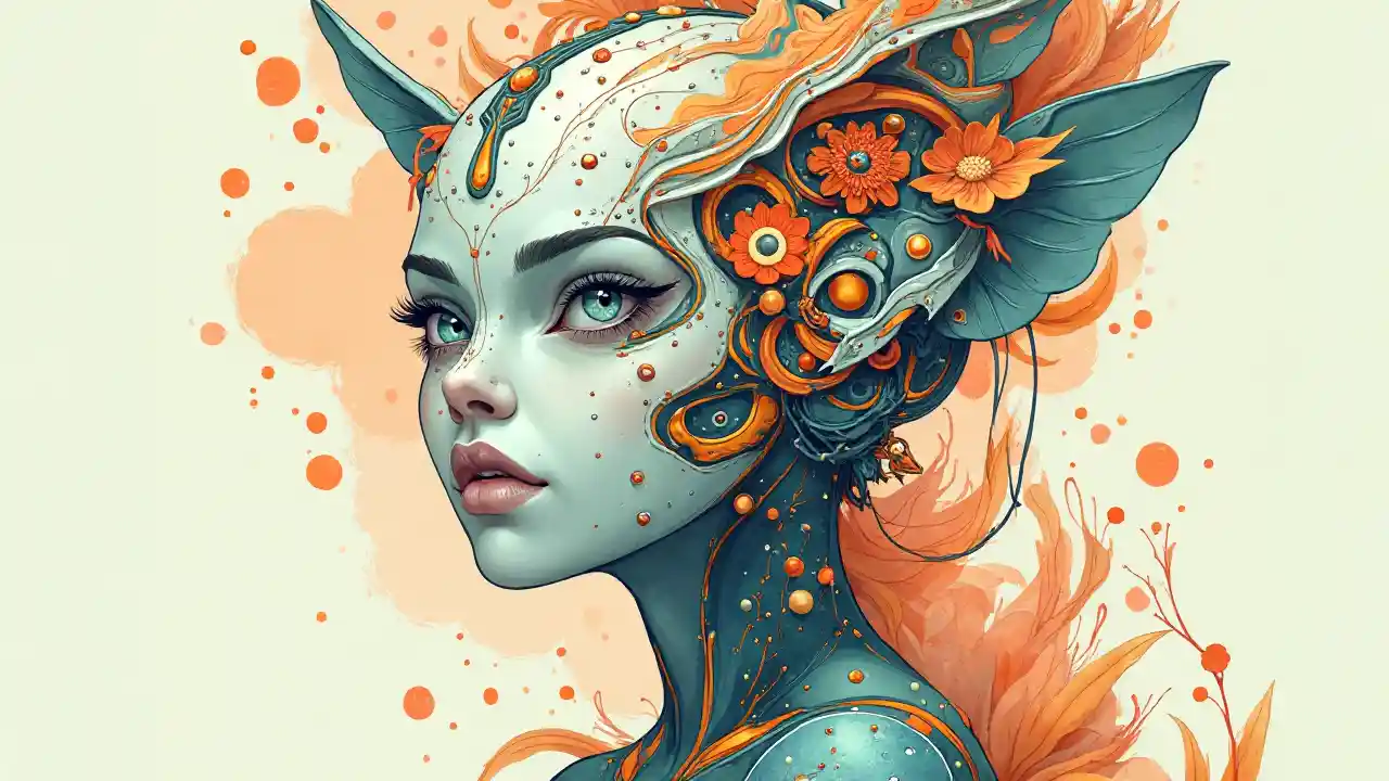 Alien cyborg sanaa na picha na Theo El, kuingizwa na usawa, akishirikiana na rangi ya rangi ya rangi ya rangi ya rangi ya rangi ya rangi ya rangi ya rangi ya bluu na rangi ya bluu. Nyuso zenye mambo madogo-madogo na muundo wenye kuongozwa na manticore unachanganya maumbo ya kikaboni. Sauti zilizopunguzwa huunda mazingira yenye upatano, na pia picha za watu na michoro tata, ambayo huonyesha muundo wa wima.